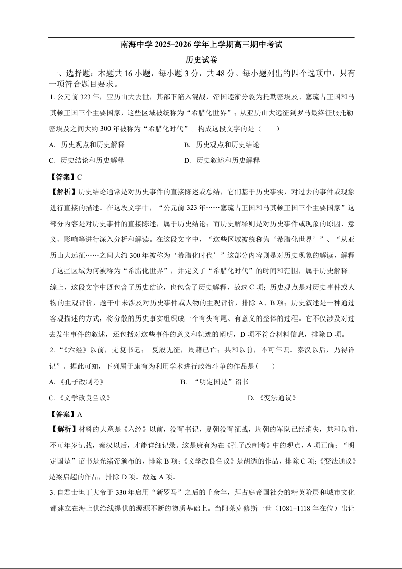 高三历史答案--广州市南海中学2025-2026学年高三上学期10月期中考试