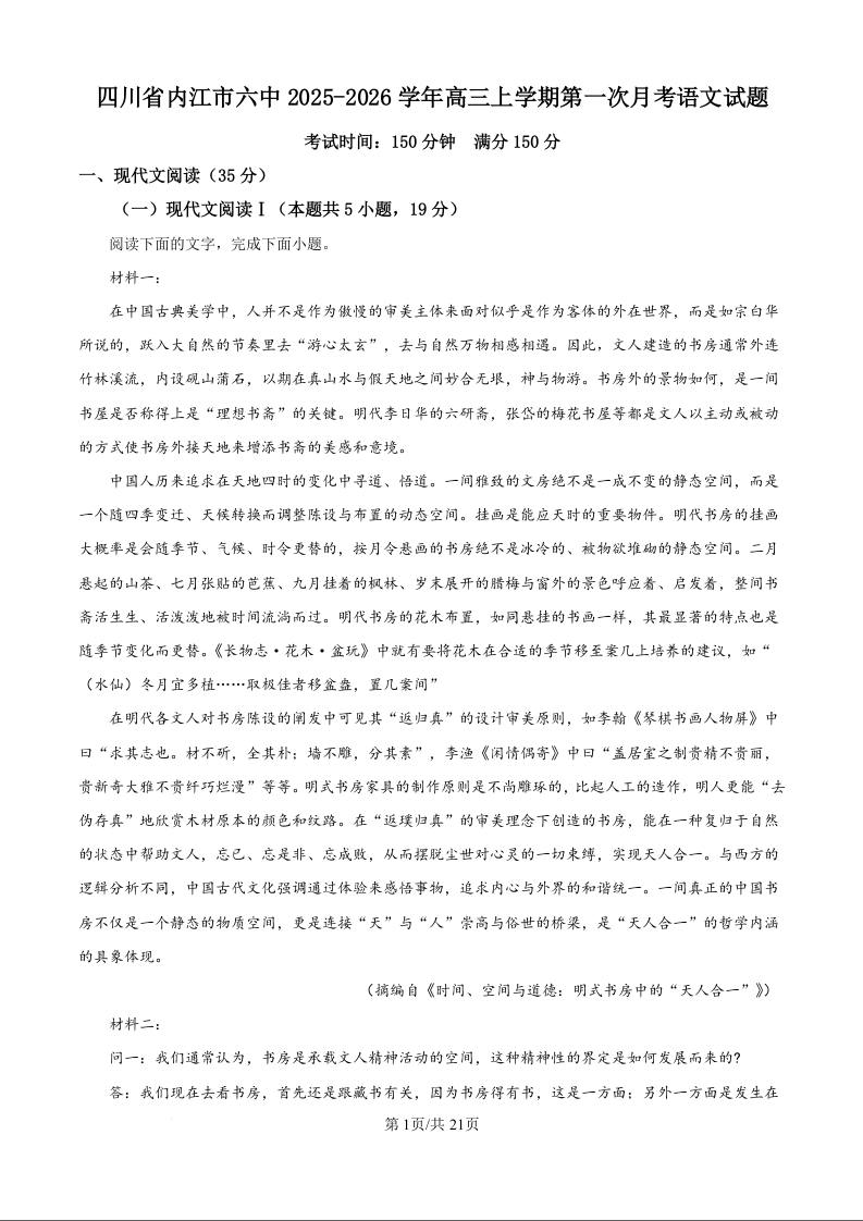 高三语文(精品解析版)--四川省内江市六中2026届高三上学期第一次月考
