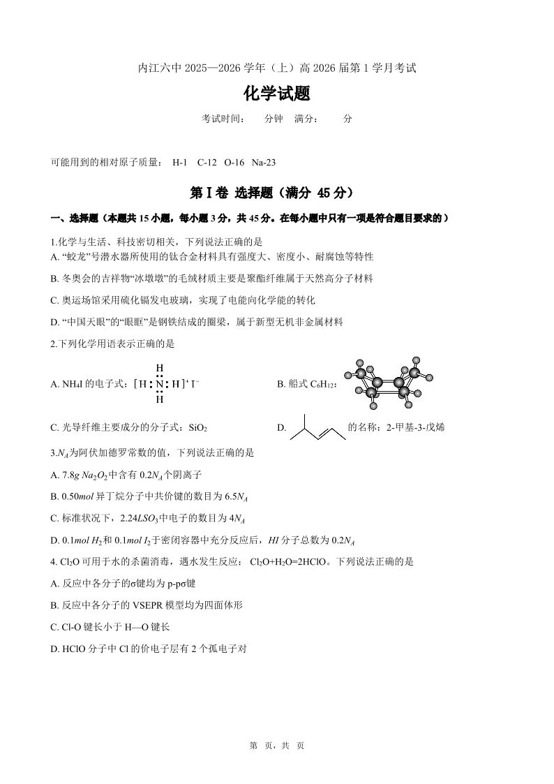 高三化学--四川省内江市六中2026届高三上学期第一次月考