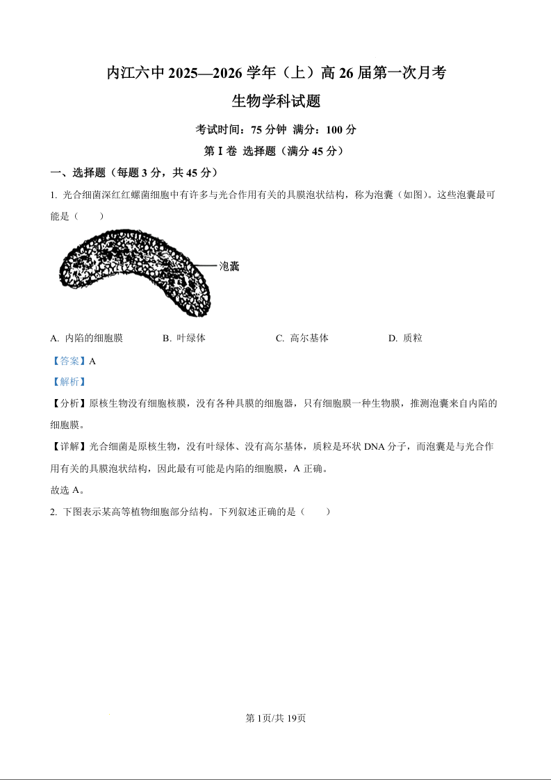 高三生物(精品解析版)--四川省内江市六中2026届高三上学期第一次月考