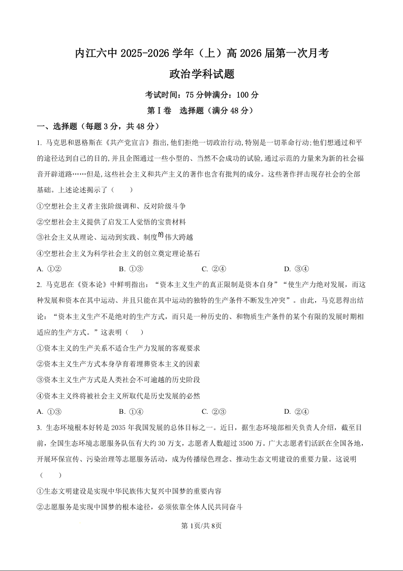 高三政治(原卷版)--四川省内江市六中2026届高三上学期第一次月考