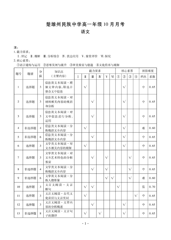 高一语文答案--云南省楚雄彝族自治州民族中学2025-2026学年高一上学期10月月考
