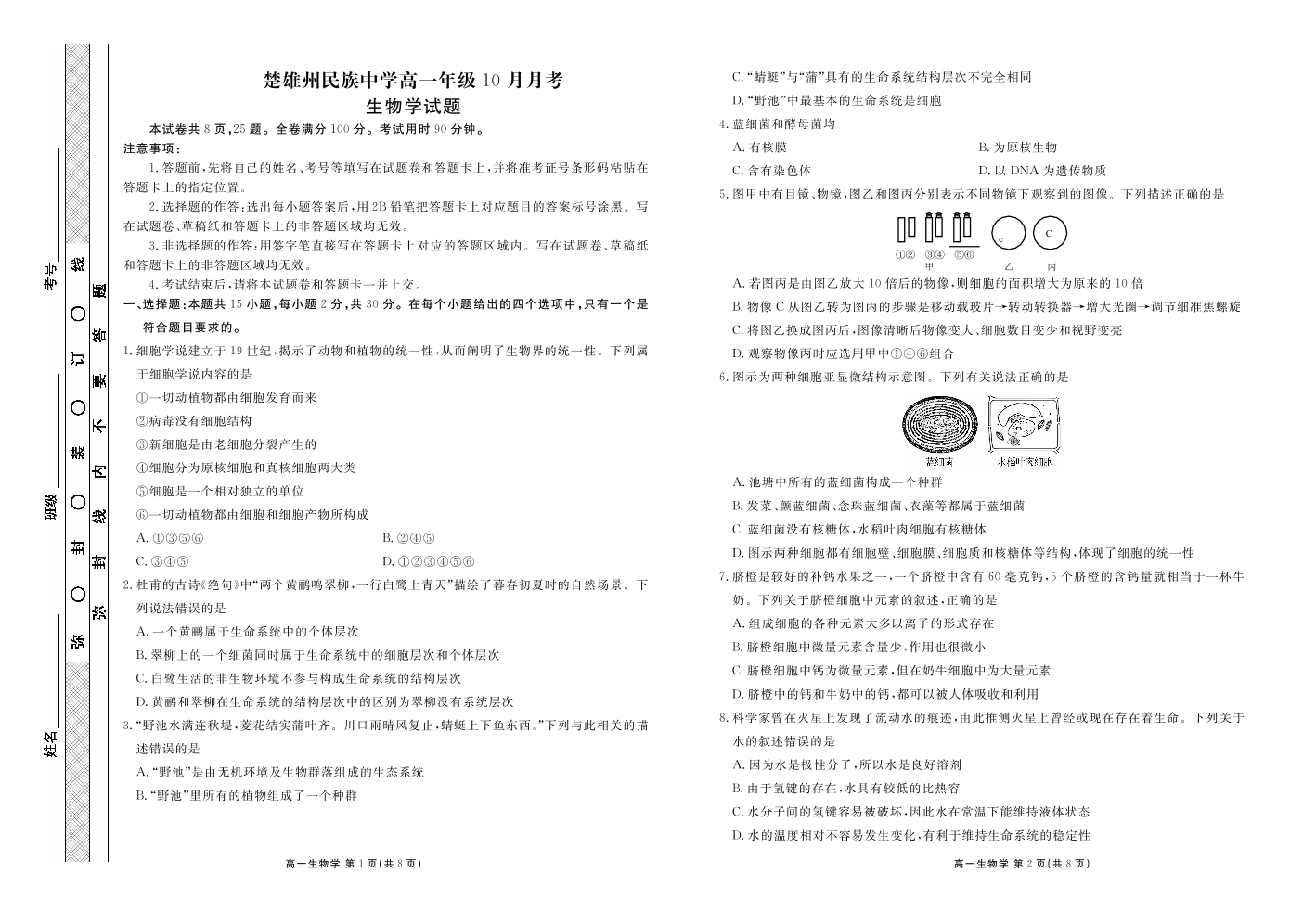 高一生物--云南省楚雄彝族自治州民族中学2025-2026学年高一上学期10月月考
