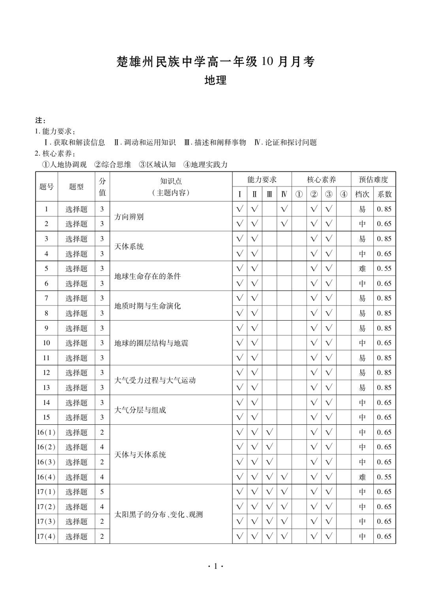 高一地理答案--云南省楚雄彝族自治州民族中学2025-2026学年高一上学期10月月考