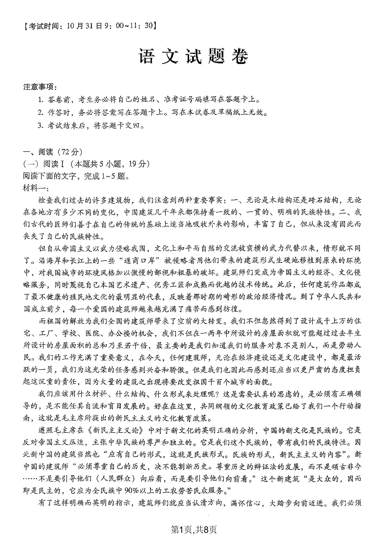高三语文--重庆市第一中学校2026届高三上学期10月月考