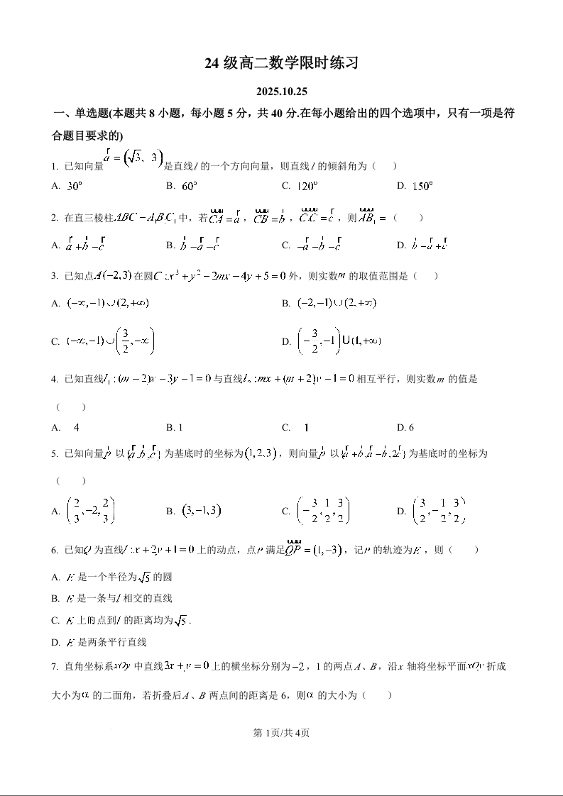 高二数学(原卷版)--山东省烟台市牟平第一中学2025-2026学年高二上学期10月月考