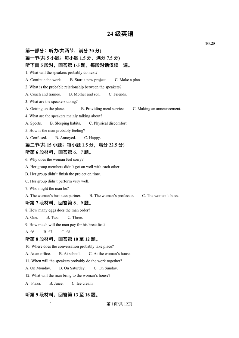高二英语+答案--山东省烟台市牟平第一中学2025-2026学年高二上学期10月月考