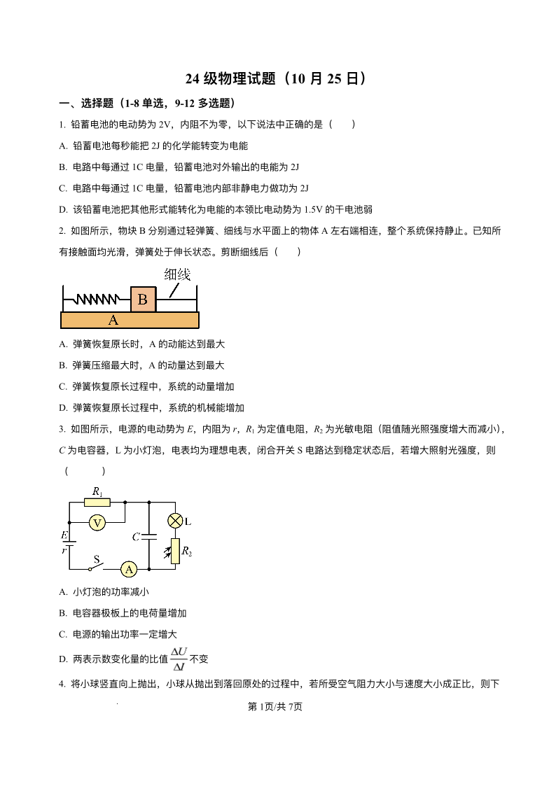 高二物理+答案--山东省烟台市牟平第一中学2025-2026学年高二上学期10月月考