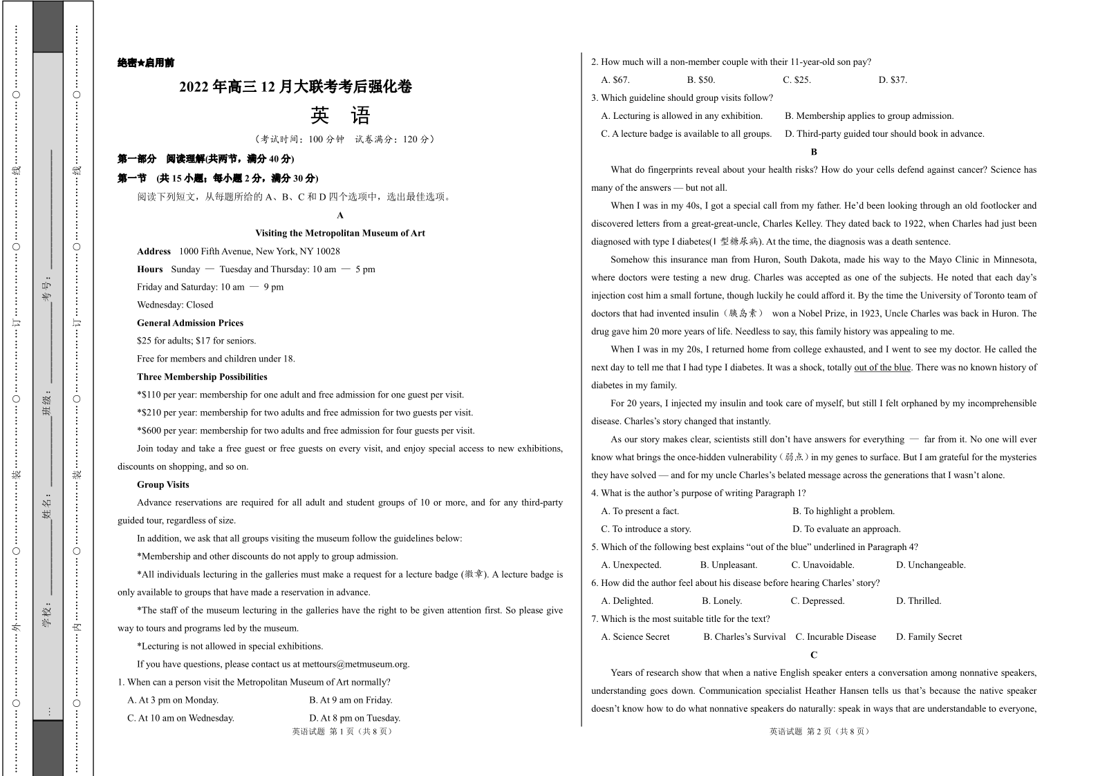 高三英语--河南省2023届部分校高三12月大联考考后强化