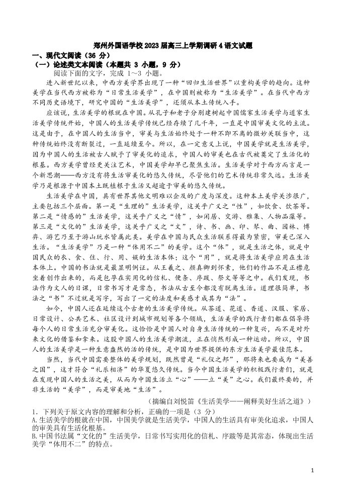 高三语文--河南省郑州外国语学校高三上学期1月调研考试(四)