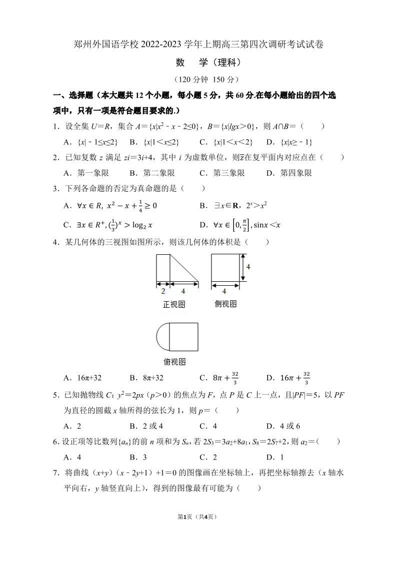 高三理科数学--河南省郑州外国语学校高三上学期1月调研考试(四)