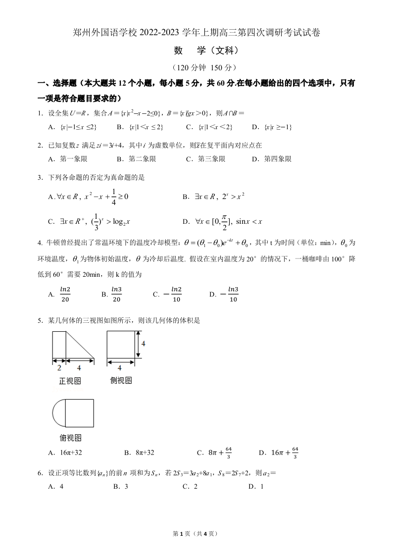 高三文数--河南省郑州外国语学校高三上学期1月调研考试(四)