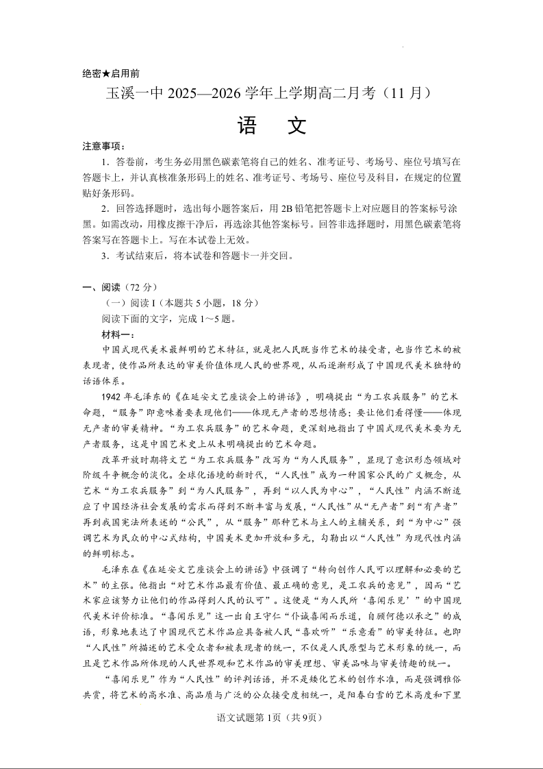 高二语文--云南省玉溪第一中学2025-2026学年高二上学期11月月考
