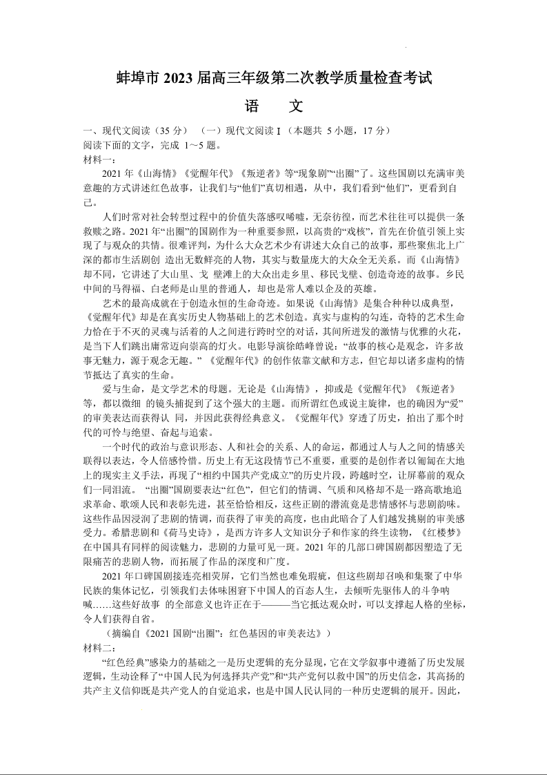 高三语文+答案--安徽省蚌埠市2023届高三第二次教学质量检查考试