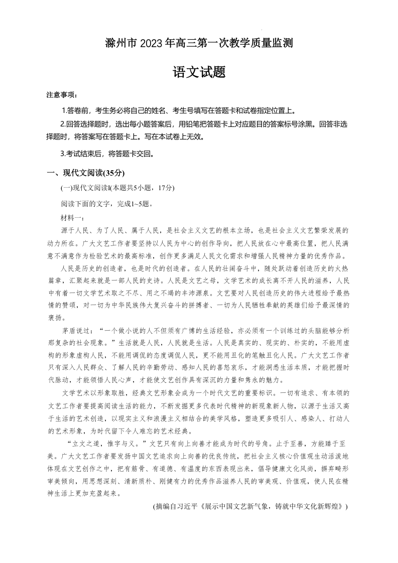 高三语文+答案--安徽省滁州市2023届高三上学期1月期末
