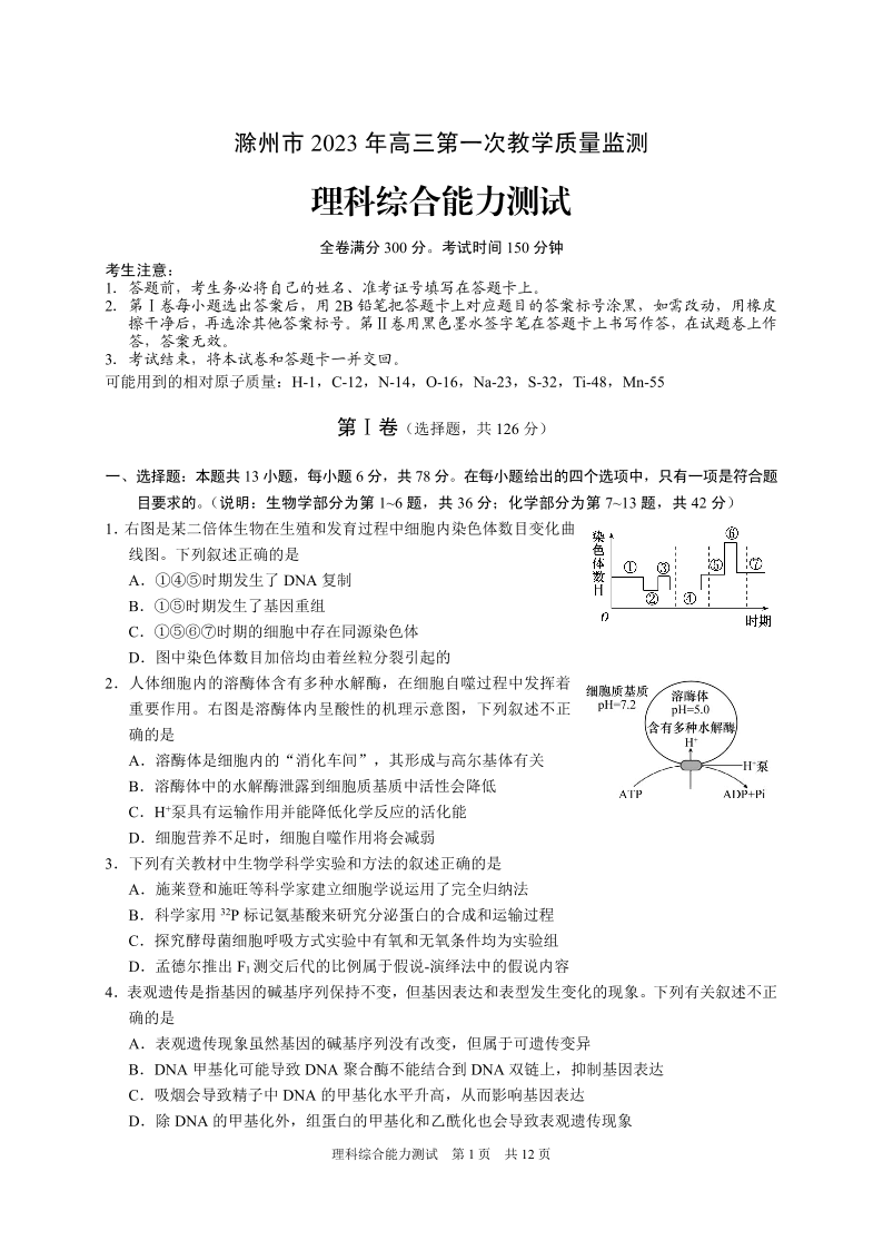 高三理综+答案--安徽省滁州市2023届高三上学期1月期末