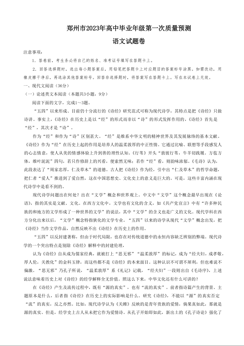 高三语文--河南省郑州市2023届高中毕业年级第一次质量预测