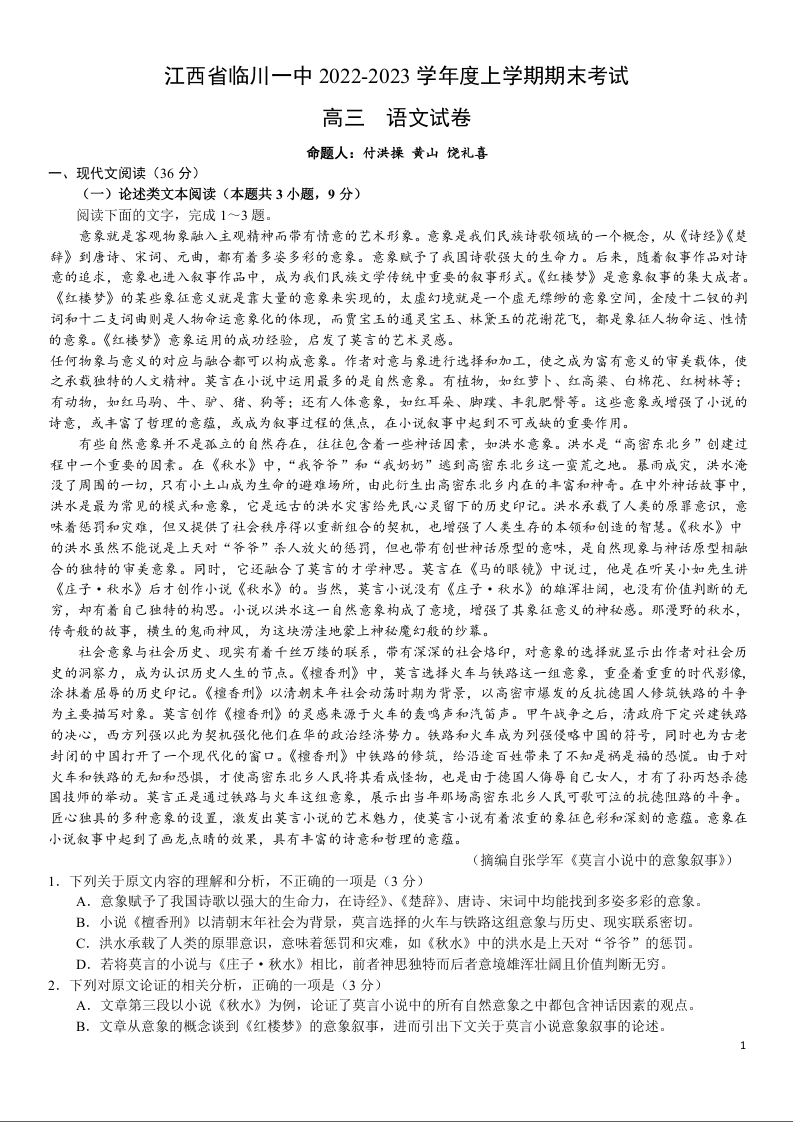 高三语文--江西省临川第一中学2023届高三上学期期末考试