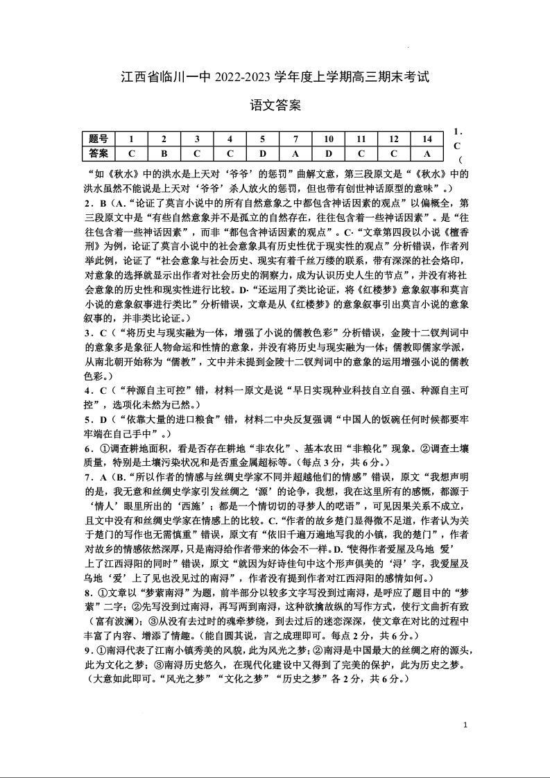 高三语文答案--江西省临川第一中学2023届高三上学期期末考试