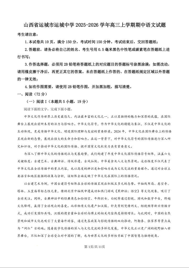 高三语文(原卷版)--山西省运城中学2026届高三上学期11月期中考试
