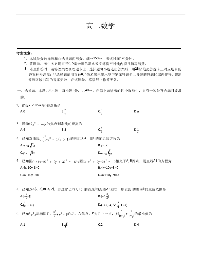 高二数学--河南省南阳市九师联盟2025-2026学年高二上学期期中考试