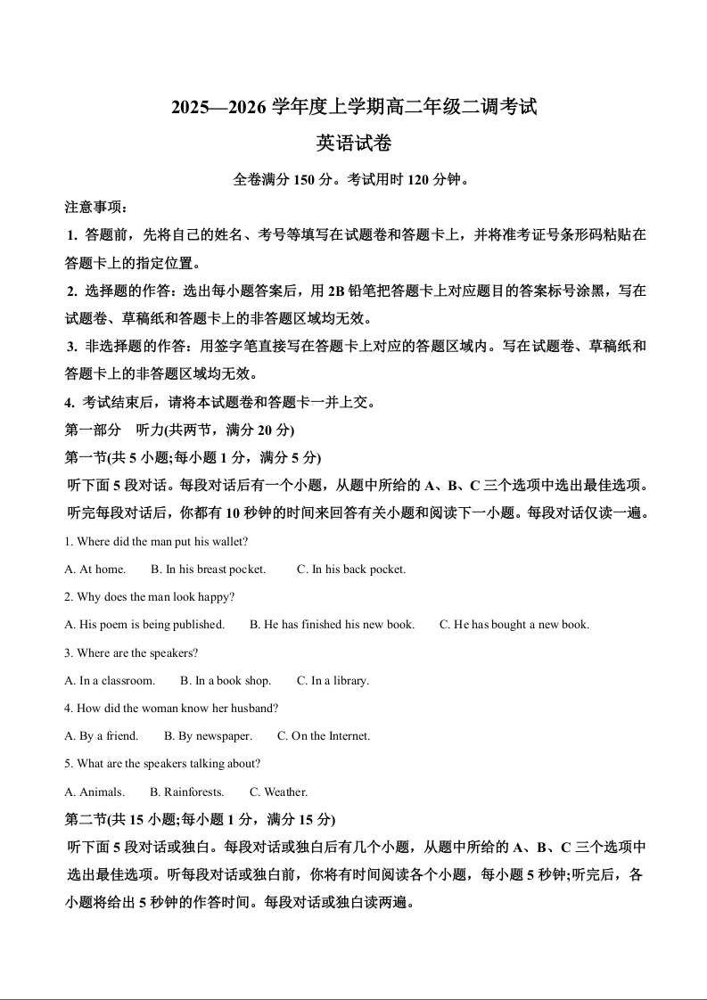 高二英语+答案--云南省多校2025-2026学年高二上学期10月月考