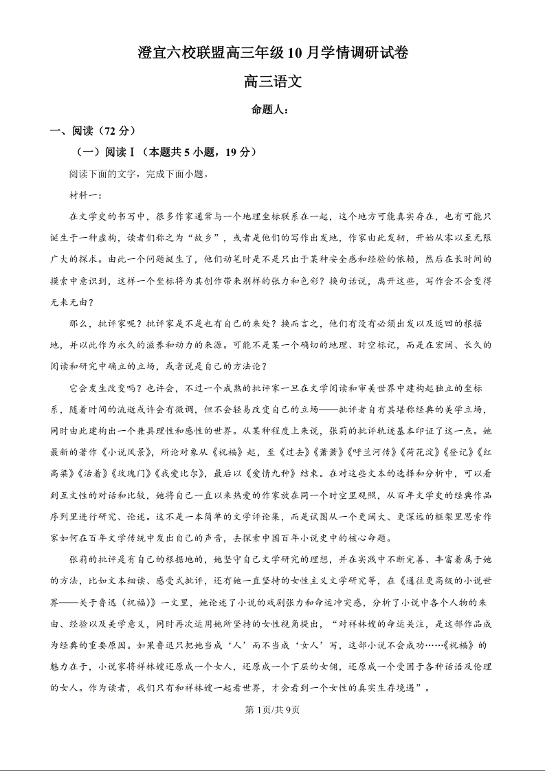 高三语文(原卷版)--江苏省无锡市澄宜六校2026届高三上学期10月学情调研