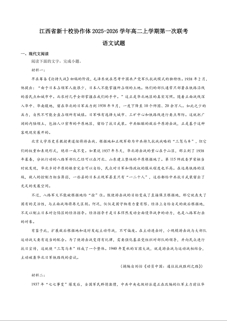 高二语文+答案--江西省新十校协作体2025-2026学年高二上学期第一次联考
