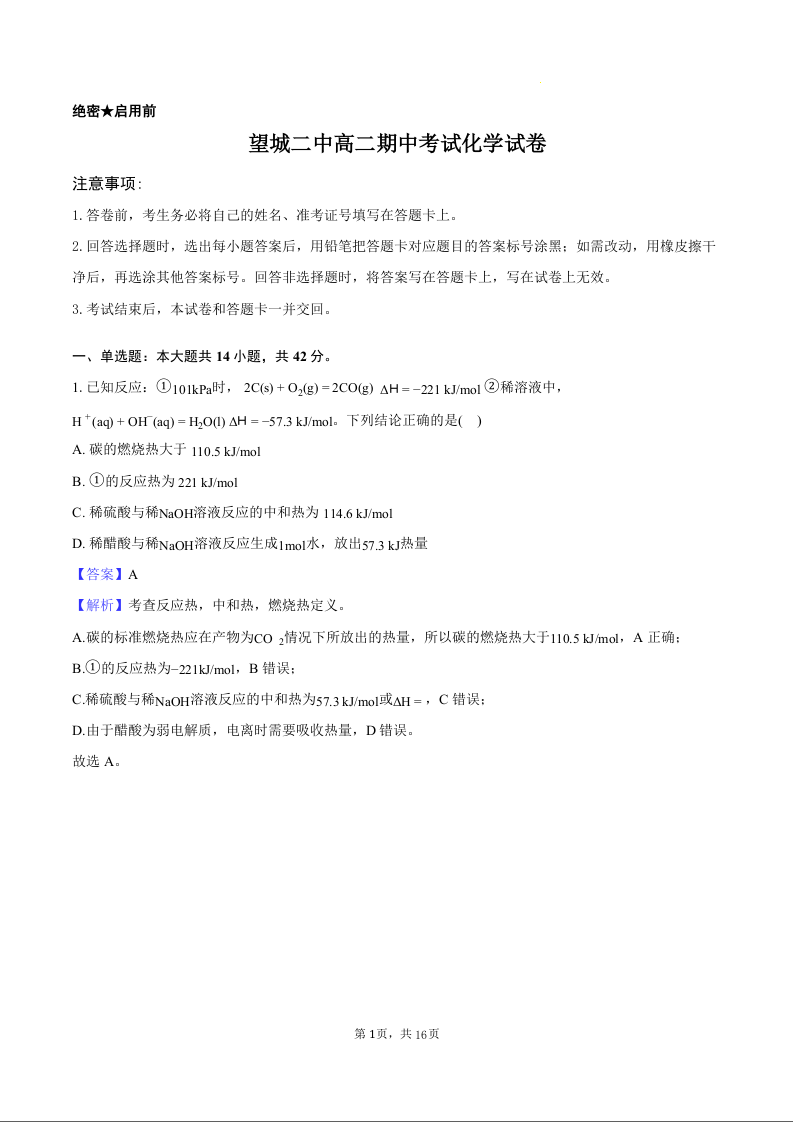 高二化学答案--湖南省长沙市望城区第二中学2025-2026学年高二上学期11月期中考试