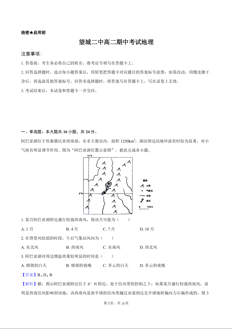 高二地理答案--湖南省长沙市望城区第二中学2025-2026学年高二上学期11月期中考试
