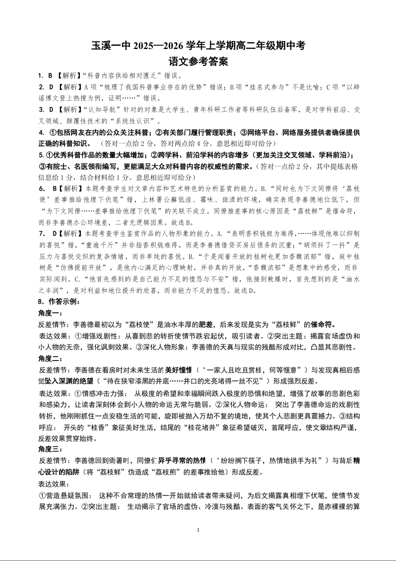 高二语文答案--云南省玉溪第一中学2025-2026学年高二上学期期中考试