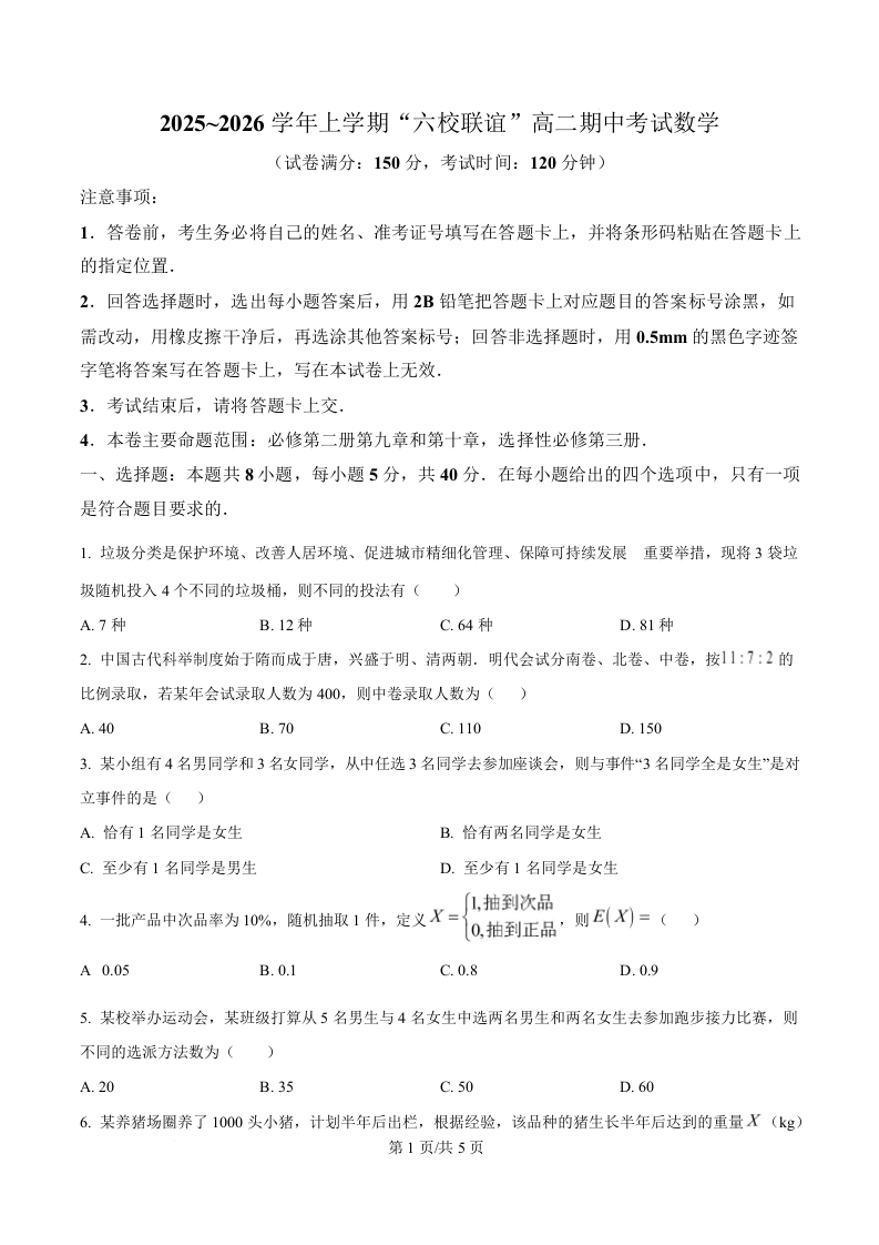 高二数学(原卷版)--黑龙江省齐齐哈尔六校联谊2025-2026学年高二上学期11月期中考试