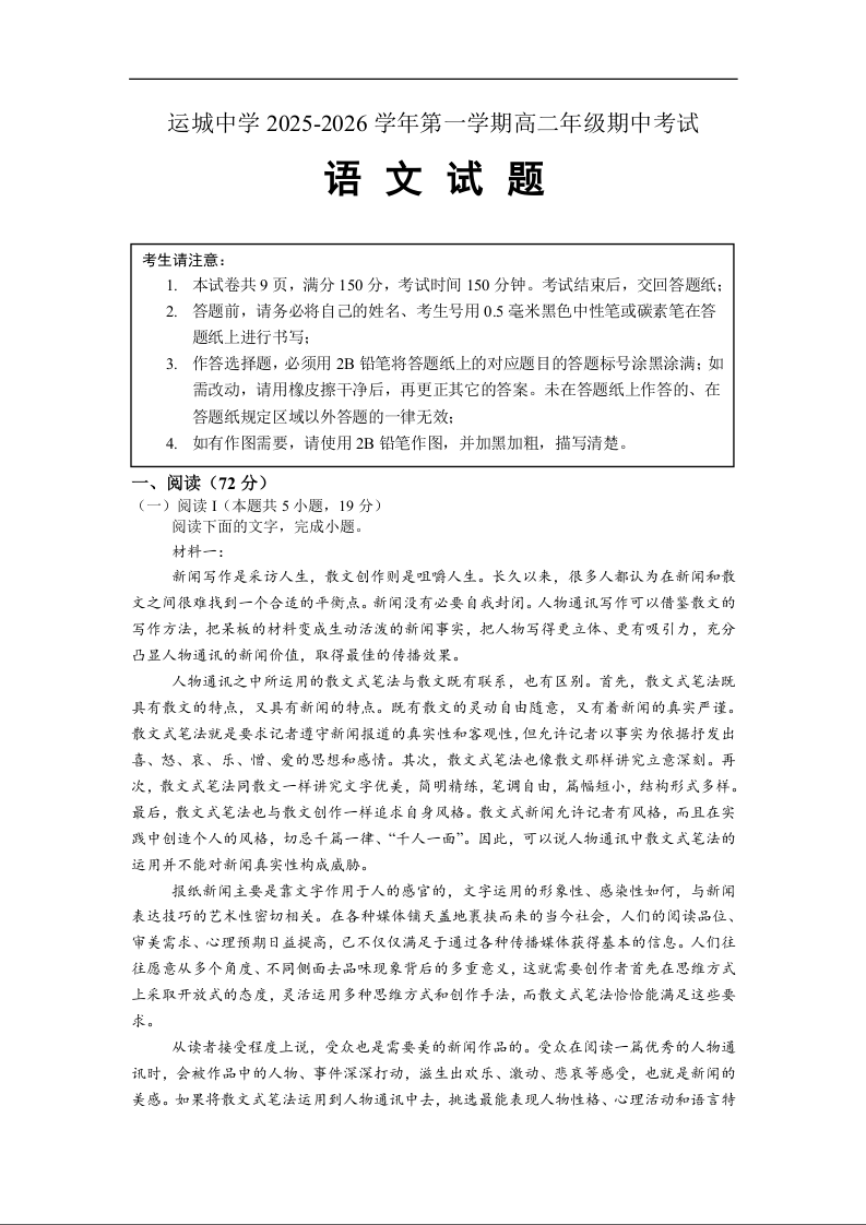 高二语文--山西省运城市运城中学2025-2026学年高二上学期11月期中考试