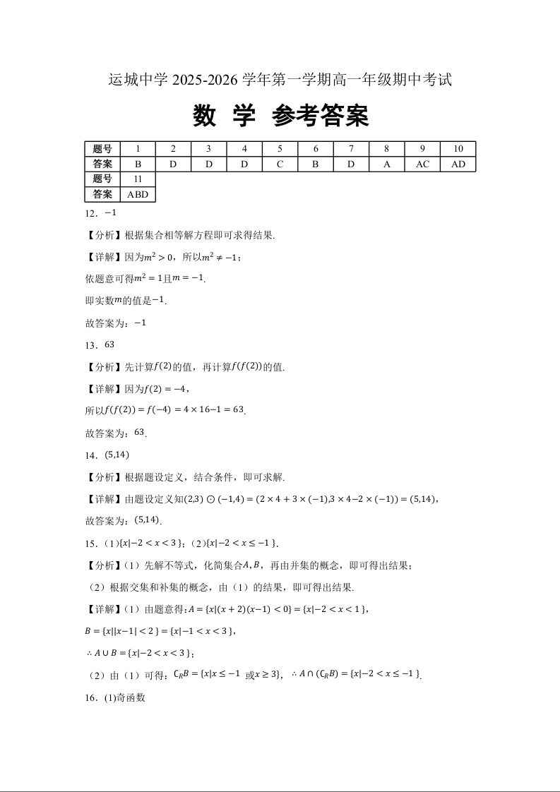 高一数学答案--山西省运城市运城中学2025-2026学年高一上学期11月期中考试