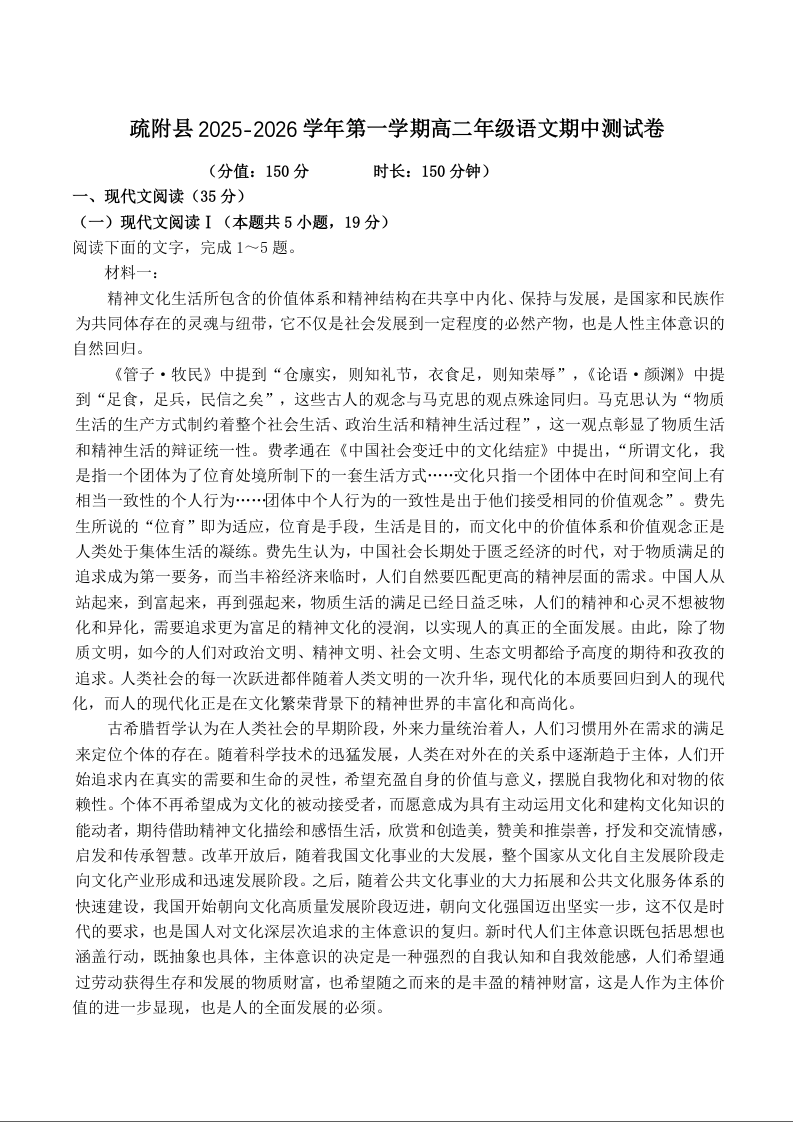高二语文+答案--新疆维吾尔自治区喀什地区疏附县2025-2026学年高二上学期11月期中考试
