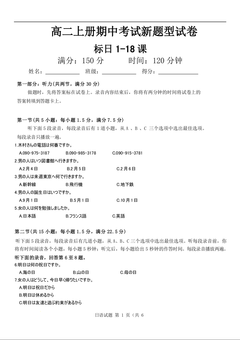 高二日语--广西省2025—2026学年高二上学期11月期中考试(金太阳26-125B)