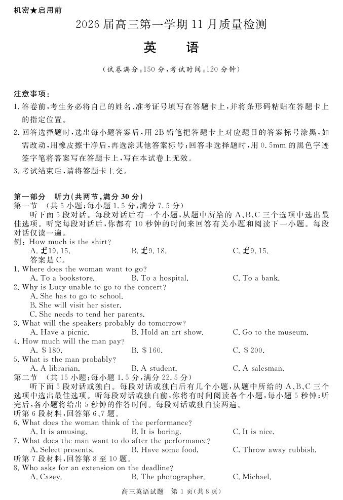 高三英语--安徽省华师联盟2026届高三第一学期11月质量检测