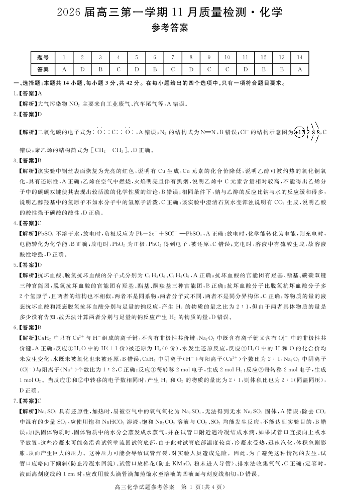 高三化学答案--安徽省华师联盟2026届高三第一学期11月质量检测
