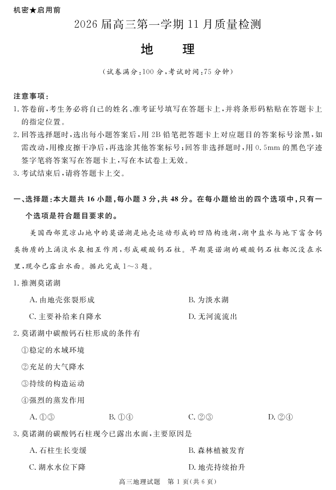 高三地理--安徽省华师联盟2026届高三第一学期11月质量检测