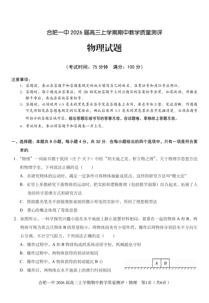 高三物理+答案--安徽省合肥一中2026届高三上学期11月期中教学质量检测