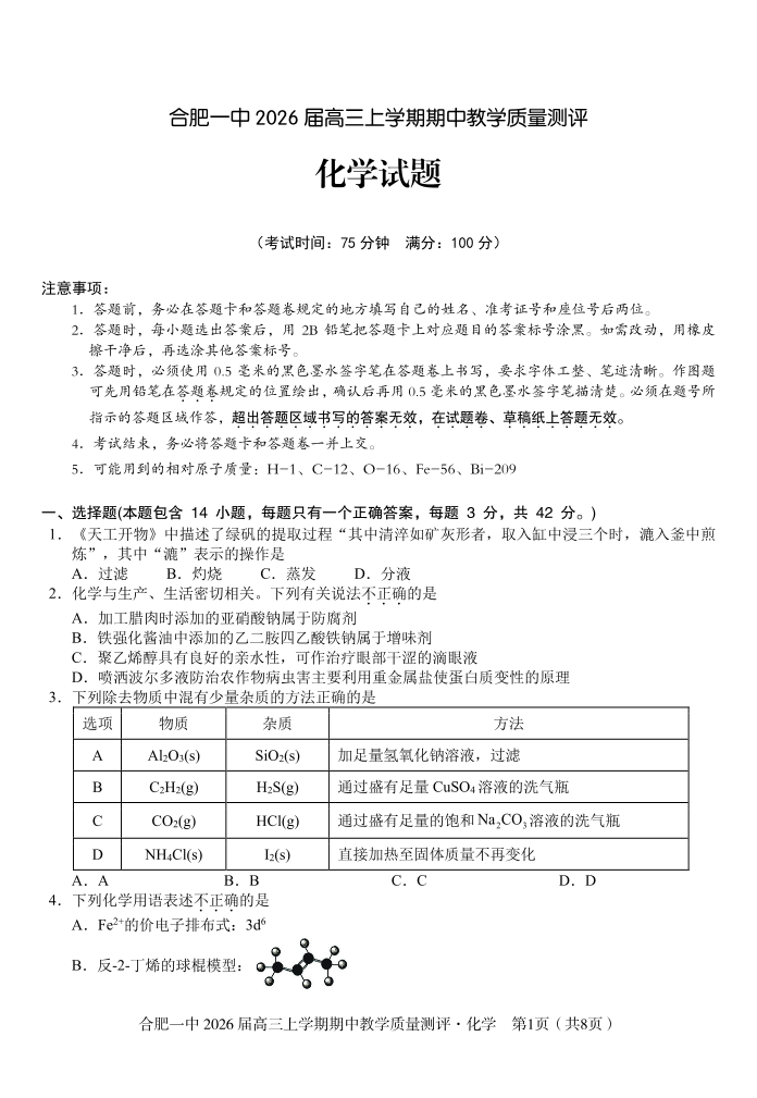 高三化学+答案--安徽省合肥一中2026届高三上学期11月期中教学质量检测