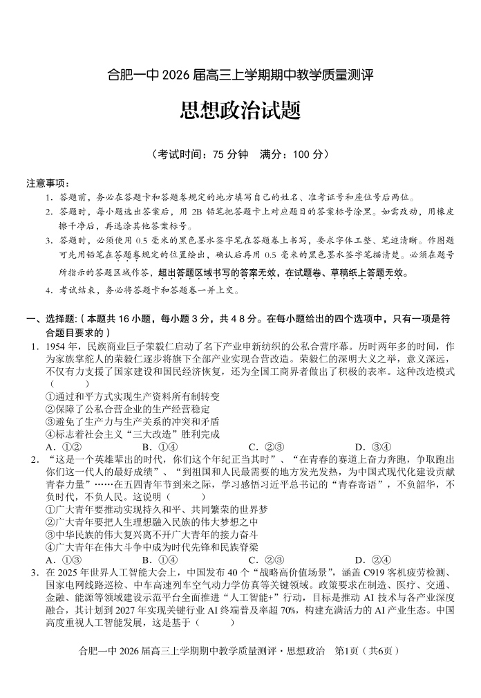 高三政治+答案--安徽省合肥一中2026届高三上学期11月期中教学质量检测