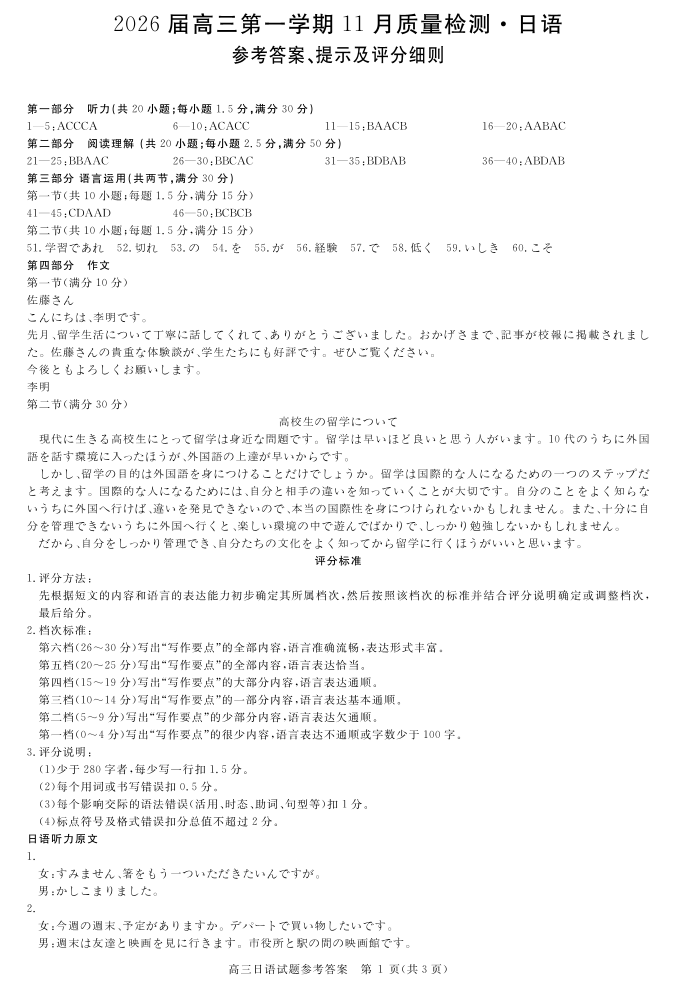 高三日语答案--安徽省华师联盟2026届高三第一学期11月质量检测