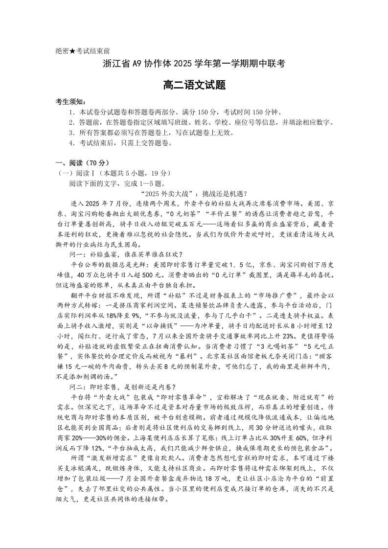 高二语文--浙江省A9协作体2025-2026学年高二上学期期中联考