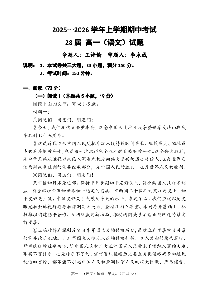 高一语文+答案--河南省郑州市第一中学2025~2026学年高一上学期期中考试