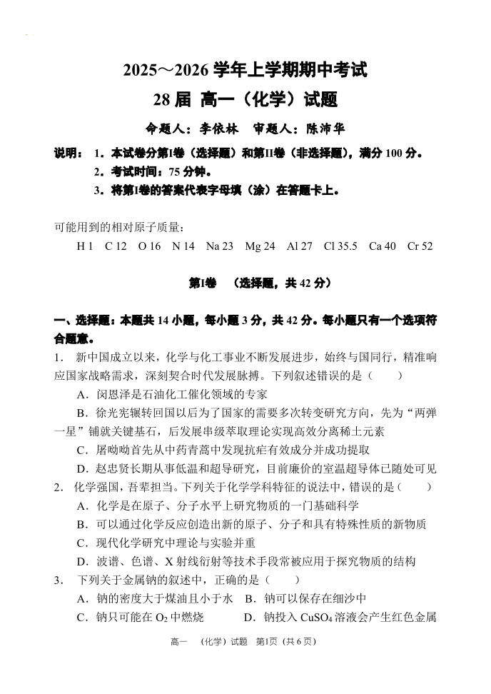 高一化学+答案--河南省郑州市第一中学2025~2026学年高一上学期期中考试