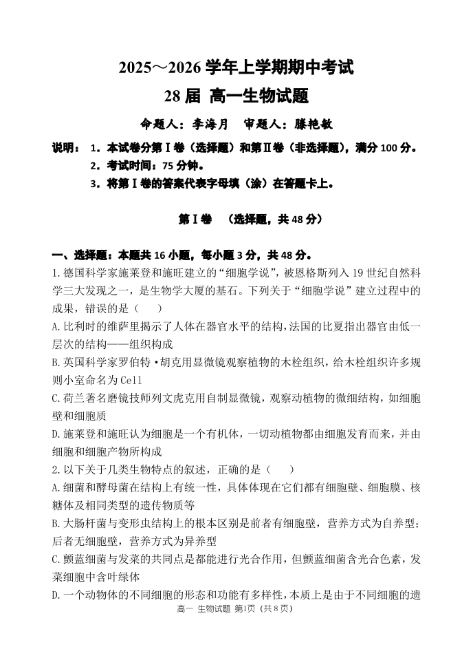 高一生物+答案--河南省郑州市第一中学2025~2026学年高一上学期期中考试