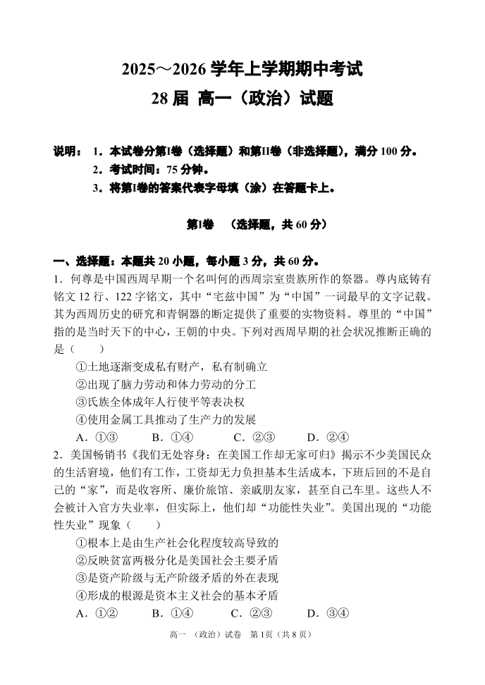 高一政治+答案--河南省郑州市第一中学2025~2026学年高一上学期期中考试