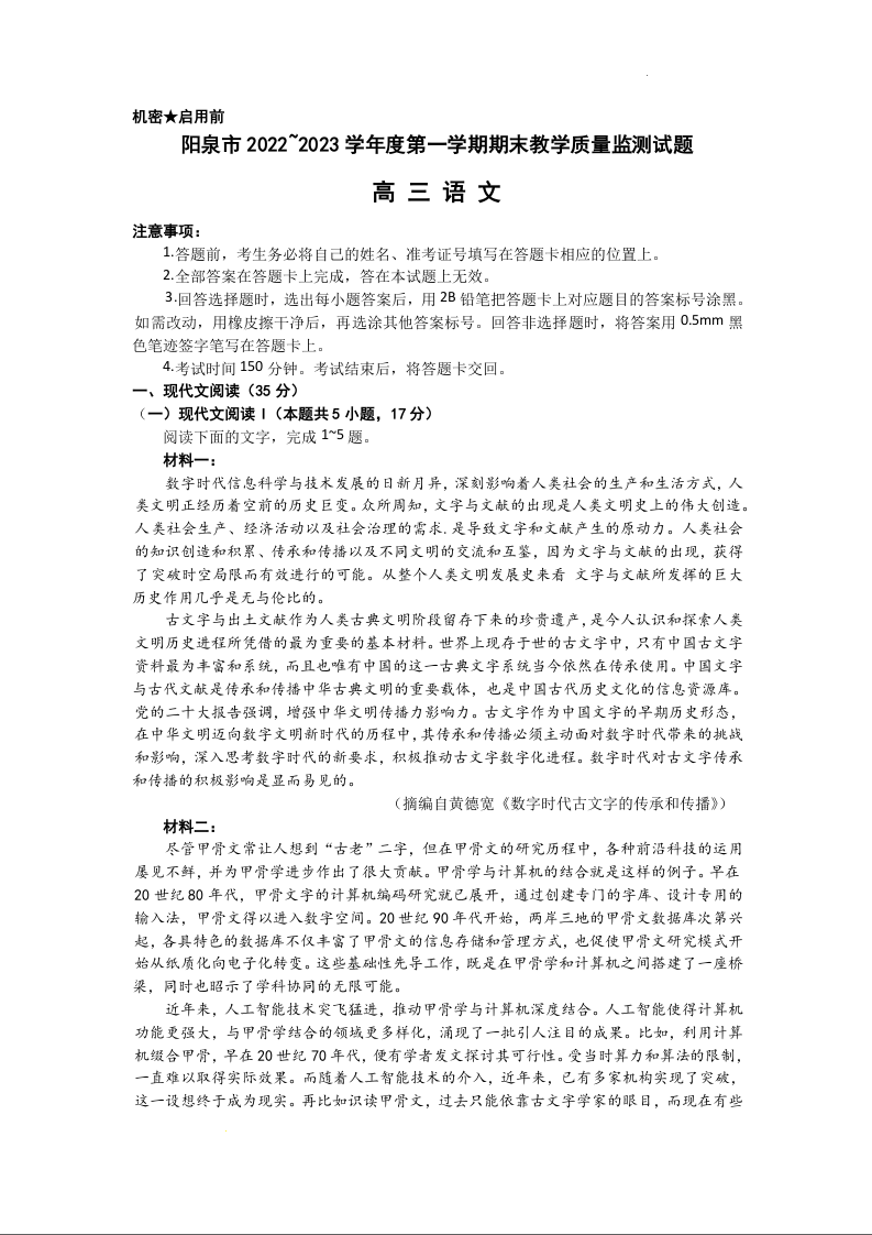高三语文+答案--山西省阳泉市2023高三上学期期末教学质量监测