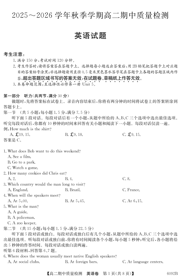 高二英语--安徽省华师联盟2025~2026学年秋季学期高二期中质量检测